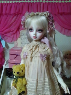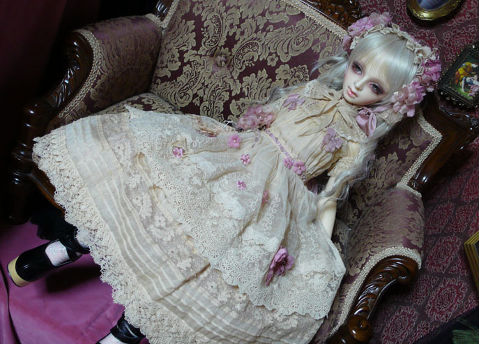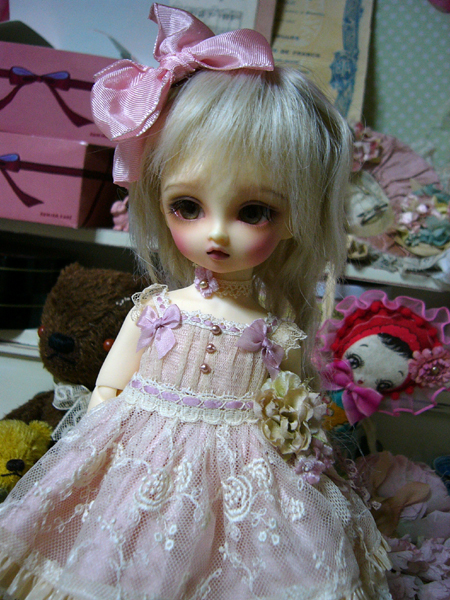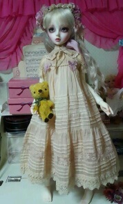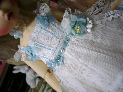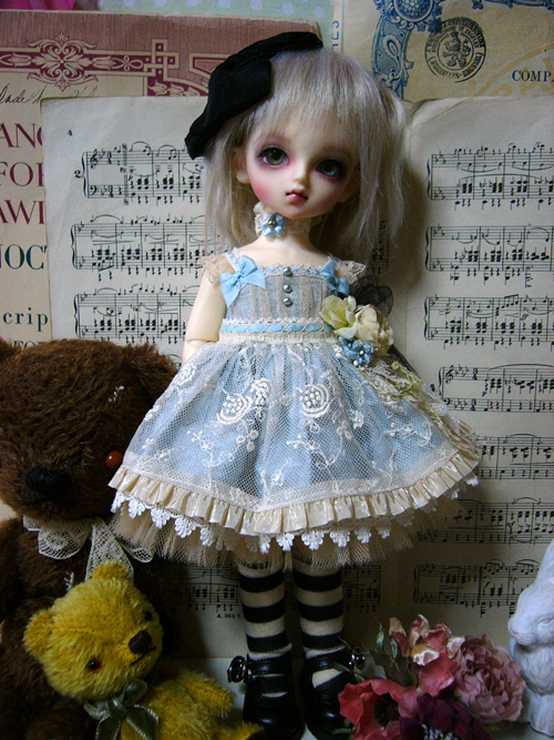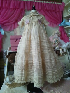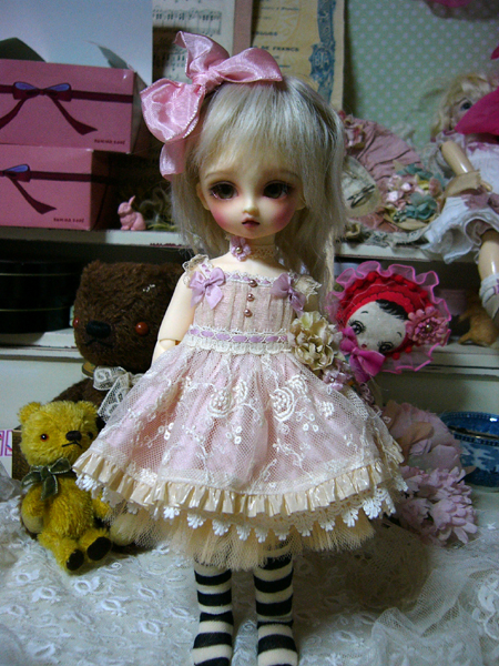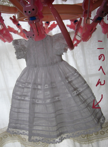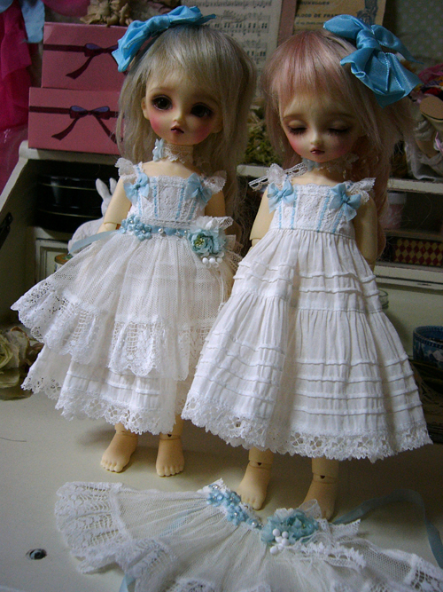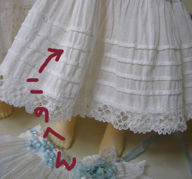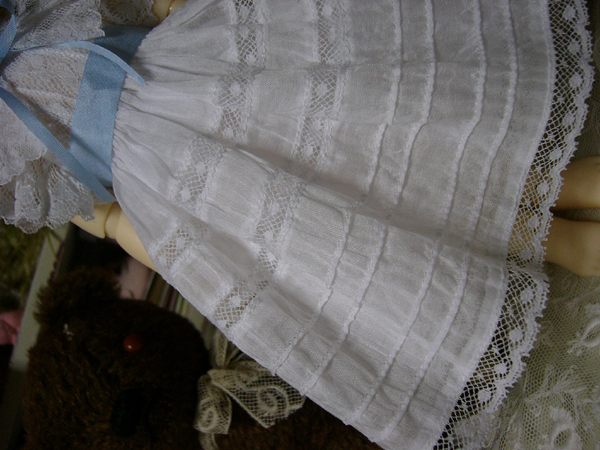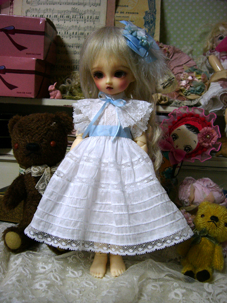 古いレースを使用しているので、同じものはつくれませんが、色も染めているので同じ色の物も作れませんが、ドルショには現行レースで、普通の綿ローンで、似たような、簡素版を作りたいな、、、と思っているのですが、まだどうなるかわかりませんv