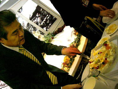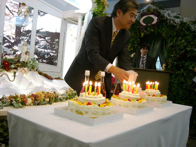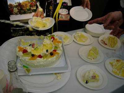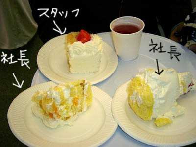 今回、200名が参加という事で、ケーキが前の方の席と後ろの方の席にあって、前が社長が切って、後ろは別のスタッフの方が切り分けて配られたのですが、